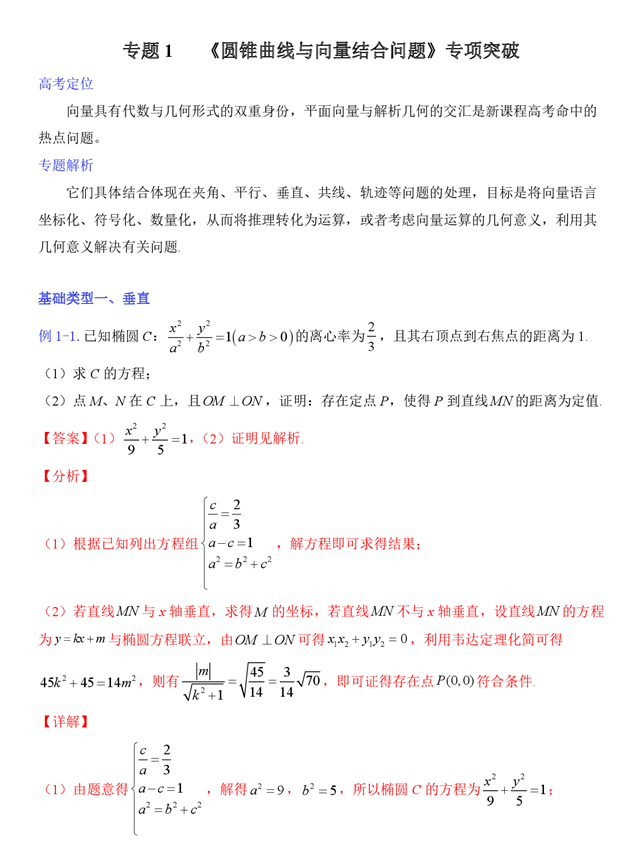 专题1 《圆锥曲线与向量结合问题》专项突破(一)